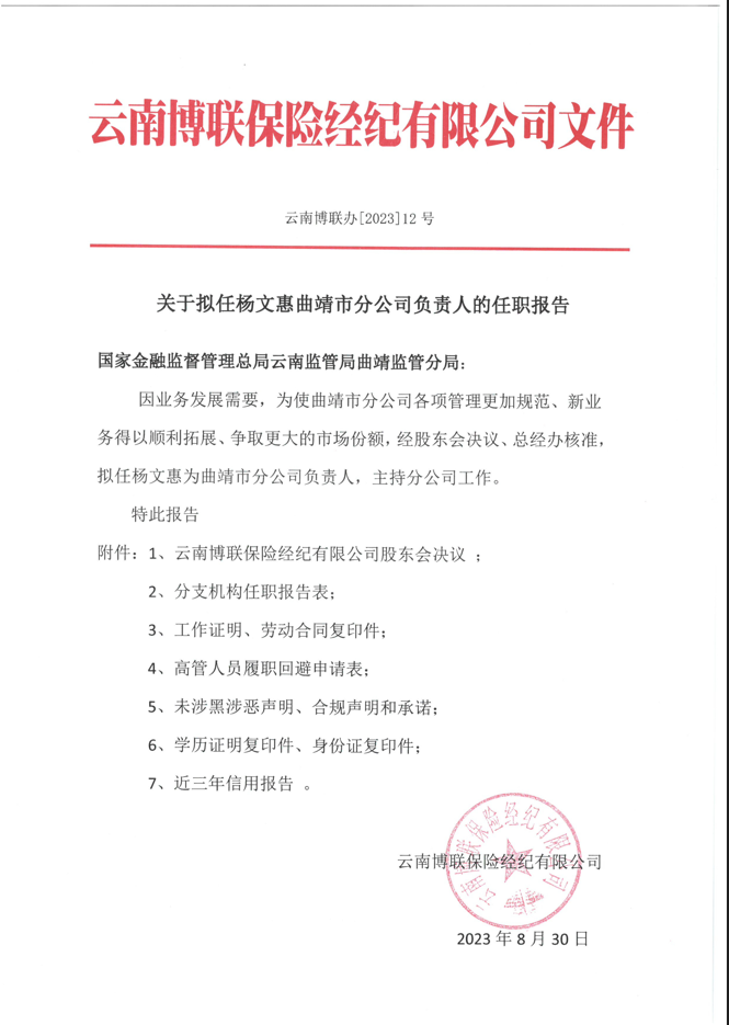關(guān)于擬任楊文惠曲靖市分公司負(fù)責(zé)人的任職報(bào)告