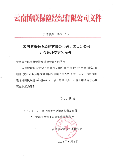 云南博聯(lián)保險(xiǎn)經(jīng)紀(jì)有限公司關(guān)于文山分公司辦公地址變更的報(bào)告