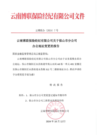 云南博聯(lián)保險經(jīng)紀(jì)有限公司關(guān)于保山市分公司辦公地址變更的報告